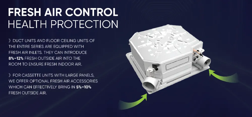 This innovative Ceiling Cassette Air conditioner is the perfect choice for both homes and businesses. Its moisture-proof wired controller ensures durability, while the low power standby mode and low voltage startup help save energy. The AC provides fast cooling and heating with a 360-degree air discharge for even airflow. It uses eco-friendly R-32 refrigerant and includes a high-efficiency compressor for optimal performance with minimal energy consumption. indoor model GUD100T1/B-S outdoor Model GUD100W1/NhB-S
